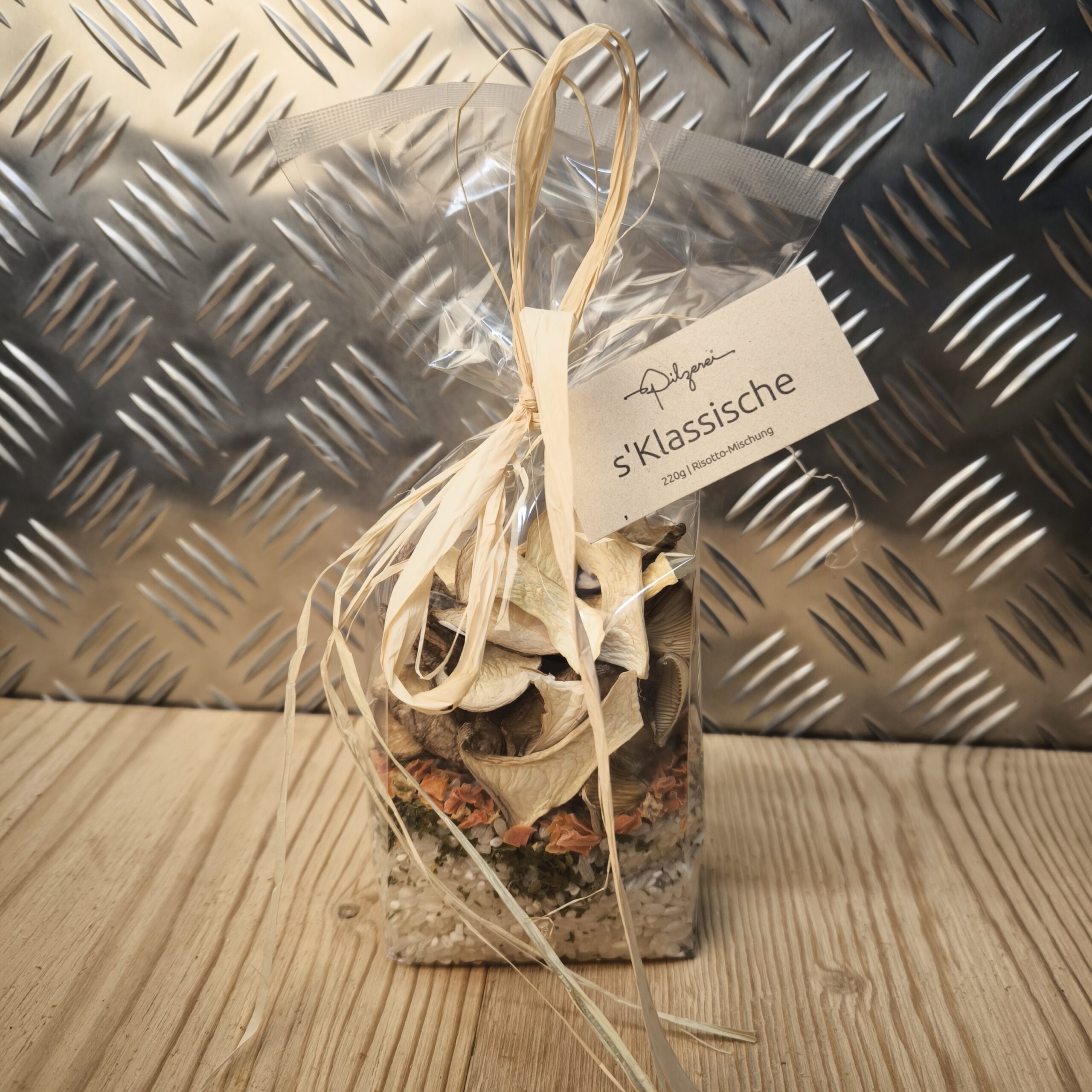 Zeitlos, herzhaft und aromatisch – die Pilzrisotto-Mischung «s’Klassische» kombiniert Kräuterseitlinge und Shiitake aus eigener Zucht mit getrockneten Karotten, Zwiebeln, Petersilie und Thymian. Diese Mischung liefert warmes, cremiges Risotto für jede Jahreszeit – ideal für ein unkompliziertes Alltagsgericht oder einen klassischen Genussmoment.